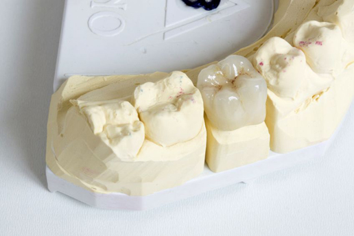 Temps d'exécution 2 jours. Composé de minimum 6 poudres (Inline Ivoclar, Dsign Ivoclar). Alliage précieux, semi-précieux et non-précieux. Résultat proche du naturel, nous apportons un soin particulier à la morphologue de la dent ainsi qu'à la bonne incorporation en bouche. L'occlusion et l'ajustage des contacts proximaux sont soignés pour peu d'ajustage sur le fauteuil. Un joint en céramique est réalisé.